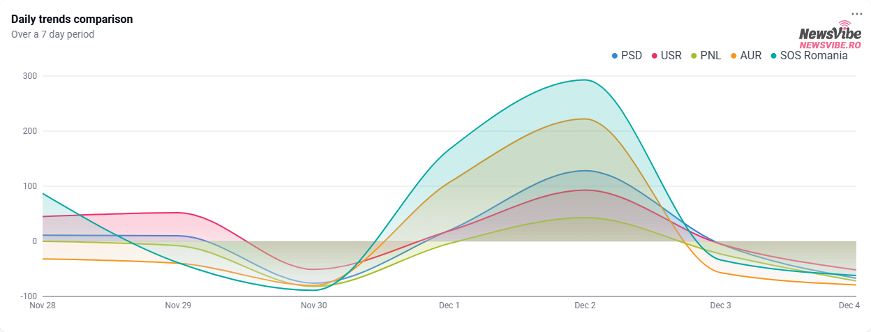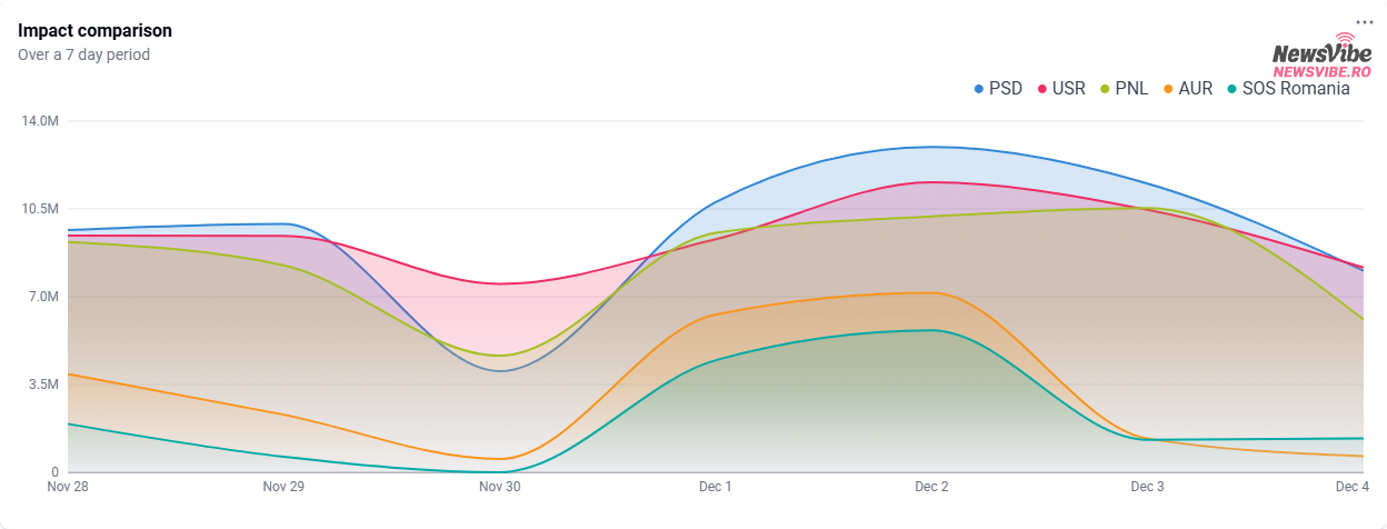 Această vârf de impact în mențiuni s-a înregistrat pe 2 Decembrie. Dezbaterile de după ziua alegerilor au generat mențiuni cu un impact estimat mai mare decât cele din ziua scrutinului. Se observă similitudinea curbelor pentru AUR și SOS România, având în vedere că o mare parte din dezbaterea publică, și implicit conversațiile online, s-au referit la ascensiunea formațiunilor suveraniste în Parlamentul României.