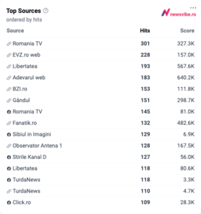 Grafic NewsVibe: Topul surselor online relevante care au menționat cel mai frecvent subiectul în ultima lună.