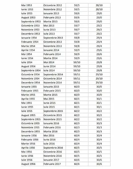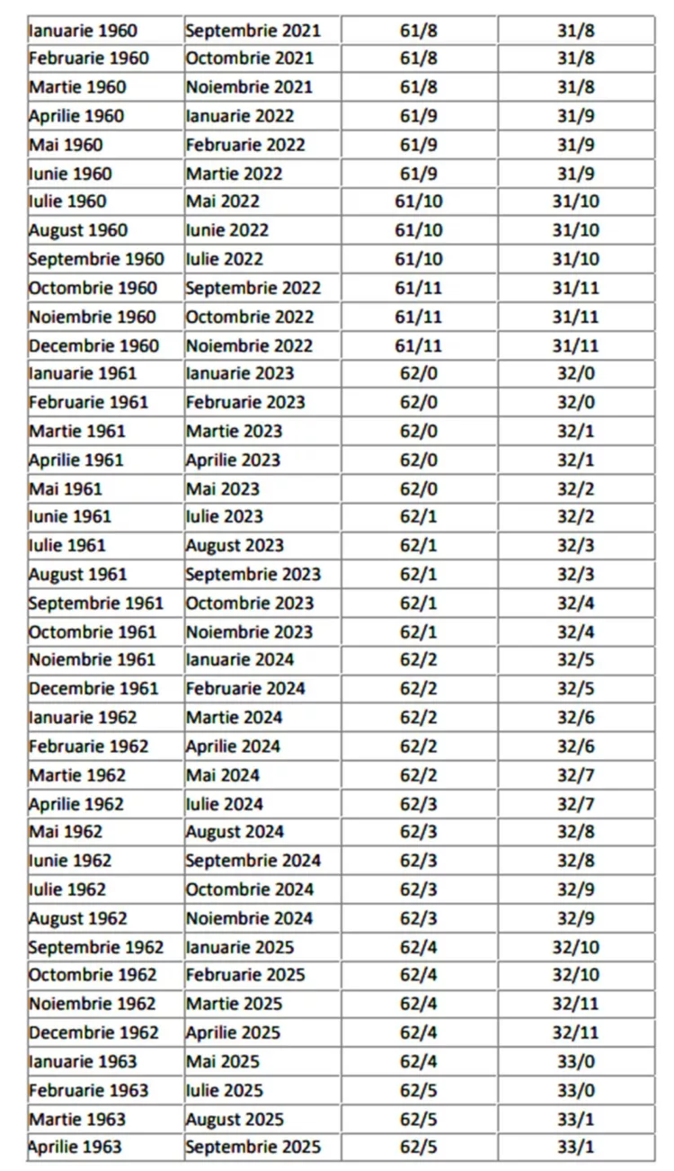 În galeria foto a articolului există un tabel pentru femei și bărbați, care vă va ajuta să descoperiți stagiul complet de cotizare în funcție de luna și anul nașterii, dar și de perioada pensionării. Numărul relevant pentru a aplica formula de calcul se regăsește în ultima coloană, iar acesta va stabili cât veți primi la pensie.