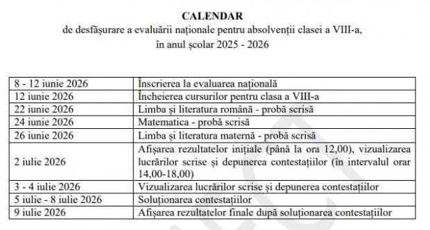 În acest context, Evaluarea Națională este programată să aibă loc între 22 și 26 iunie 2026, cu afișarea primelor rezultate pe 2 iulie și a celor finale pe 9 iulie.