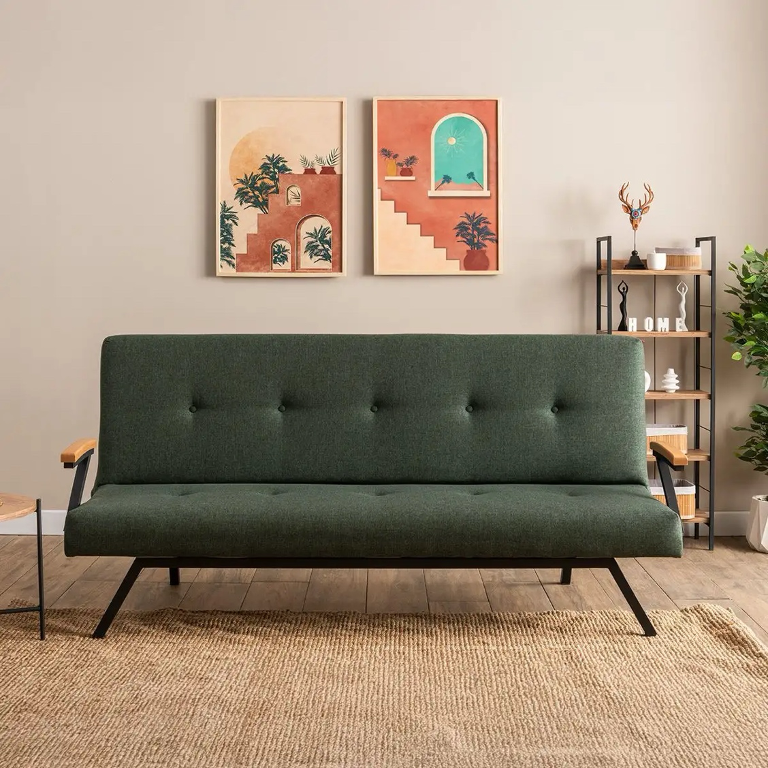 Aceasta este o canapea minimalistă, într-o nuanță de verde kaki, cu detalii în stil industrial. Picioarele negre și înalte facilitează curățenia sub mobilier, iar bratele au inserții din lemn, aducând un strop de căldură designului. Spătarul se rabatează ușor, transformând canapeaua într-un pat confortabil pentru una sau două persoane.