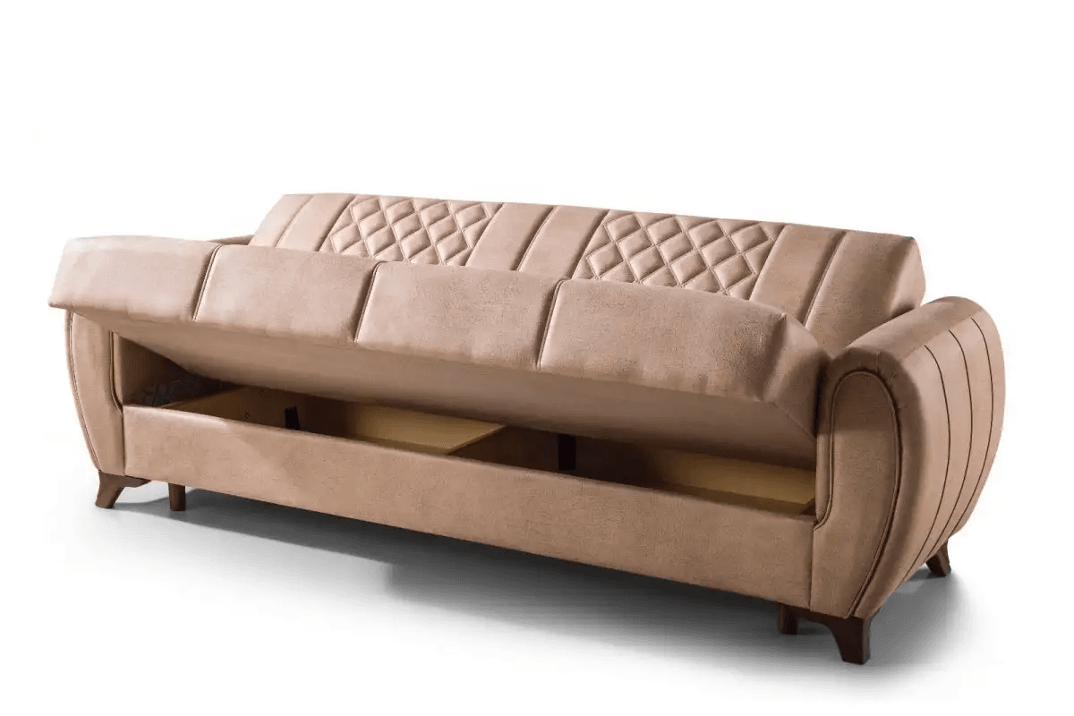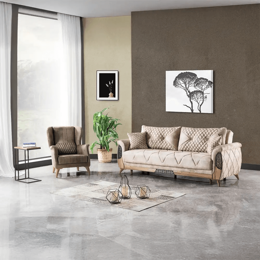 Un model cu influențe scandinave, având inserții și picioare din lemn, perne generoase și cusături în formă de romb, care adaugă profunzime texturii. Stofa bej se încadrează perfect în tendințele actuale, iar extensia tip click-clack o face practică pentru orice locuință.