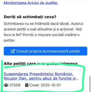 O petiție online, inițiată de un cetățean român pe 1 octombrie 2025, a câștigat rapid popularitate, adunând aproape 40.000 de semnături în câteva zile. Semnatarii cer Parlamentului României să demareze procedurile necesare pentru suspendarea președintelui Nicușor Dan, acuzându-l de abuz de putere, interferențe în justiție și discreditarea României pe plan internațional.